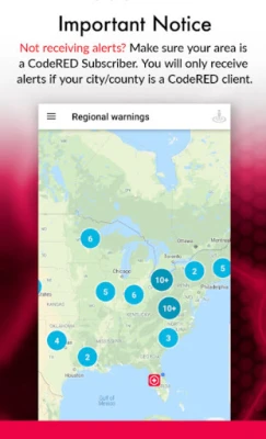 *PLEASE NOTE: If the public safety agency covering your current location is not subscribed to the CodeRED service, you will not receive alerts through this application. If your city or state does not currently subscribe to CodeRED, contact your local public safety organization today to let them know that your community would benefit from this service.