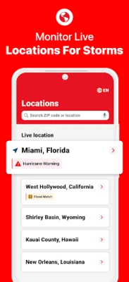 • Live notifications for tornadoes, hurricanes, severe thunderstorms, floods, and more