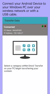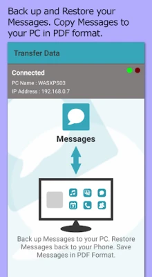 Transfer Companion provides additional functionality when used with PC Application "Droid Transfer". Using Transfer Companion and Droid Transfer together - you can backup messages, music, photos and other files on your Android Phone. Communication between your PC and your phone is completely local either over a Wi-Fi or a USB connection, and no information is stored, uploaded to the Cloud, or transmitted to a third party.