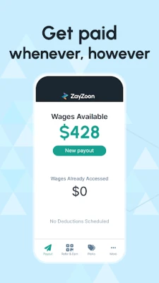 ZayZoon allows you to access your earned but unpaid wages to avoid payday loans, late bill payments and overdraft fees. Its financial wellness tools provide overdraft prediction, financial tracking and financial education.
